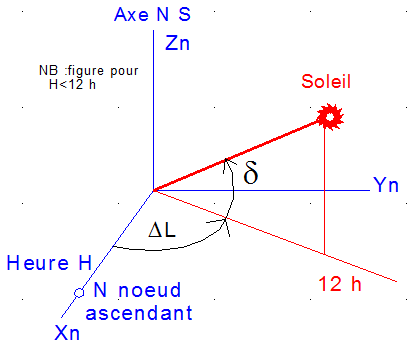 Le décalage angulaire DL du soleil, en longitude, dans le repère Xn Yn Zn associé au nœud ascendant vaut compte tenu de 15°/heure