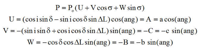 ATTENTION !!! Calculs seulement dédiés aux orbites circulaires héliosynchrones, pour un satellite, de normale N au plan des panneaux solaires dans le plan (Y, Z ) H = Heure locale au nœud ascendant, ang = angle d'inclinaison des panneaux, i inclinaison orbitale héliosynchrone, Po puissance maximum des panneaux d (J) = la déclinaison solaire du jour J , DL = 15(12-H) longitude nodale du soleil en degrés, Z = altitude orbitale, RT = rayon terrestre, T = période orbitale |