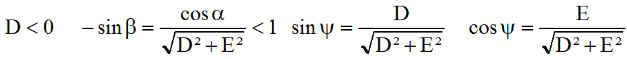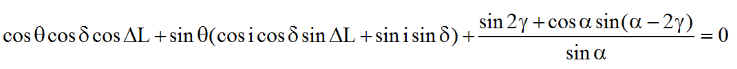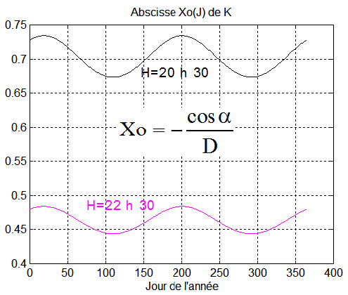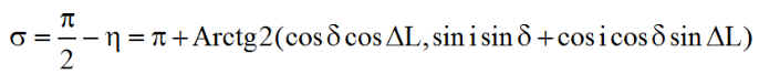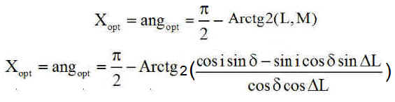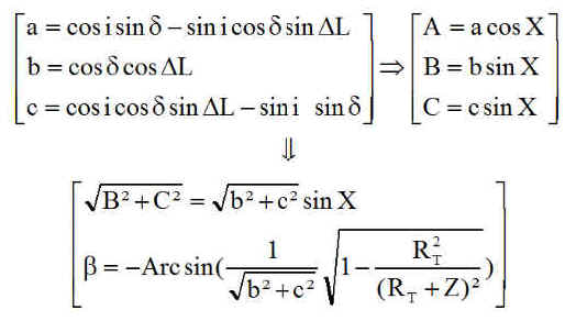 NB : comme DL = -127°.5 pour H = 20 h 30 ou -157°.5 pour H = 22 h 30, la constante B est toujours < 0 alors que C peut s'annuler, pour une déclinaison de -6°242 correspondant environ aux jours 65 et 300. Ce qui pourrait nous créer de sérieuses difficultés pour inverser la tangente. Attention, il vaut peut être mieux utiliser Arctg2(B,C), pour éviter les singularités de l'inversion de la tangente ( voir annexe 0 ).