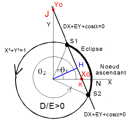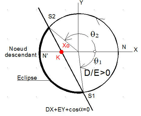 Regardons par exemple, si le nœud ascendant N est ou n'est pas en éclipse. Le calcul de D donne ainsi, pour q = 0