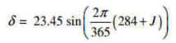 On rappelle une formule simple de Fletcher, donnant la déclinaison, en degrés, du soleil, suivant le jour de l'année( Il en existe bien d'autres, suivant la précision souhaitée )