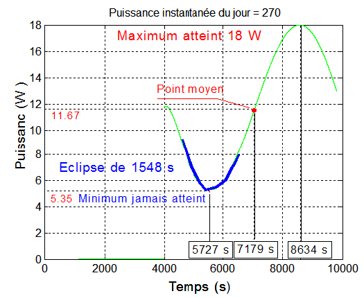 Vérifications : pour une orbite Z = 615 km H = 20 h 30 et J = 270, des panneaux à 35° on a : A = 11.67 B = 6.28 C = 0.65 ce qui donne une puissance fonction de la position sur l'orbite q = wt