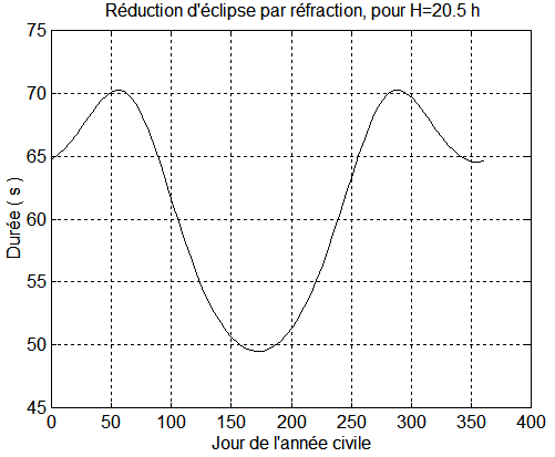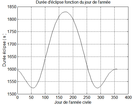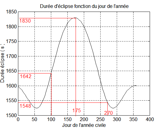 Nous avons déjà étudié par ailleurs les durées d'éclipses, ce qui a fourni le graphe suivant, par exécution de D:/TIR_2019/energies/t_eclips.m initialisé par energdat.m
