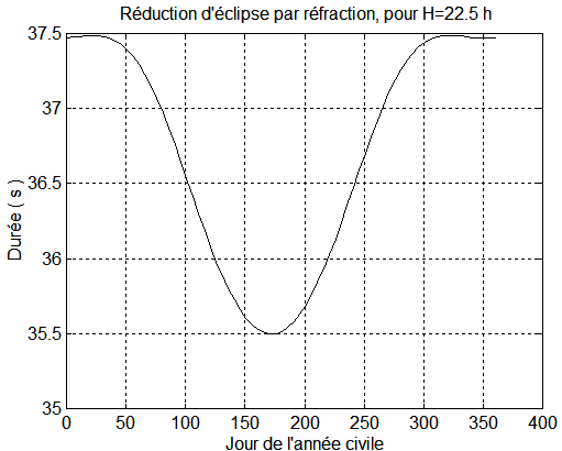 Durée d'éclipse avec réfraction des rayons solaires D= 1544 secondes