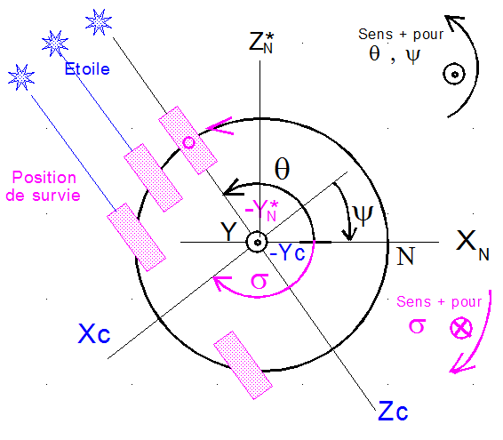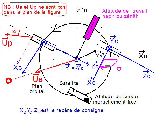 Le mode survie consiste à placer, chaque jour J, dans le plan orbital, le satellite dans une orientation fixe, donnée par l'angle s = (XN,XC) mesuré autour de Yc = -Y