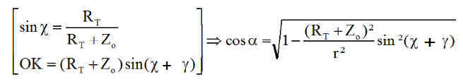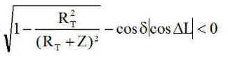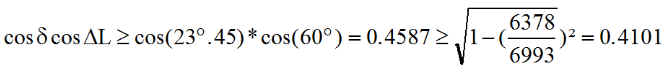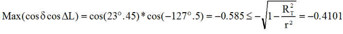 NB : Pour nos applications, avec r = 6993 km ( altitude 615 km ) et H = 20 h 30 ( DL = - 127°.5 ) ou 22 h 30 ( DL = - 157°.6 ), on peut vérifier que, quelle que soit la déclinaison, la relation est satisfaite au nœud ascendant, car par exemple pour H = 20 h 30