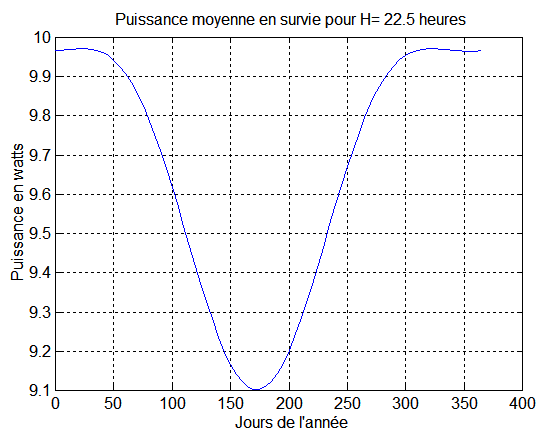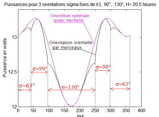 Compromis possible pour une régulation simplifiée [ 0 < jour < 100 et 265 < jour < 365 --> s = 90°] [100 < jour < 265 --> s = 130° ] Puissance minimale moyenne, compte tenu des éclipses, garantie de 12 W avec perte limitée à 0.5 W |
