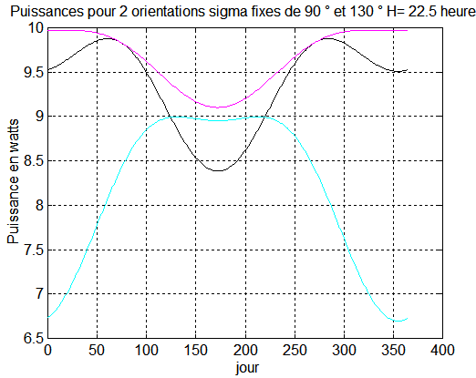 - graphe=9 --> Courbes simplifiée de puissance pour l'orientation sigma fixée à 63°, 90° ou 130° et sigma optimisée