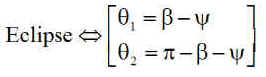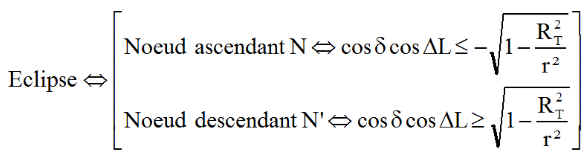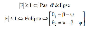 Dans ces conditions, une éclipse n'est possible que si |F| <= 1, ce qui donnera 2 solutions pour q notées q1 pour la plus petite valeur et q2 pour la plus grande.